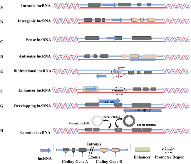 LncRNAs can also be classified based on their genomic organization or their relation to protein coding genes as: 1) intronic lncRNAs (produced from an intron of a gene), 2) intergenic lncRNAs (existing between two protein coding genes), 3) sense lncRNAs (overlapping one or more exons of a coding gene and in the same direction and strand), 4) antisense lncRNAs transcripts (arising from the opposite strands having a partial or complete sequence complementarity, 5) bidirectional lncRNAs (transcribed in opposite directions but sharing the same promoter regions with protein coding genes), and 6) enhancer lncRNAs (eRNA- produced from enhancer regions of proteins) and circular RNA [28] (Figure 1).