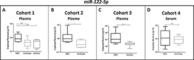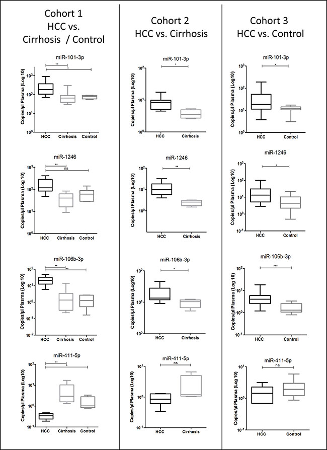 We evaluated the 4 candidate miRNAs (miR-101-3p, miR-1246, miR-106b-3p, miR-411-5p), which emerged in a preliminary RNAseq experiment, in independent cohorts of HCC patients, in patients with liver cirrhosis without cancer, and in healthy individuals.