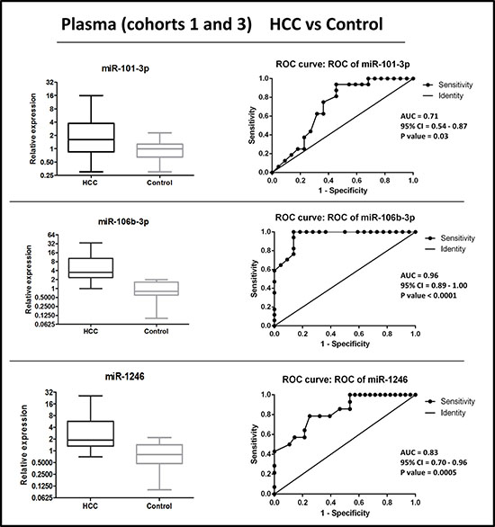A significantly higher level of miR-101-3p, miR-1246 and miR-106b-3p was found in the plasma of HCC patients in comparison with control subjects, irrespective of the fact that controls were cirrhotic or healthy individuals. Each one of these miRNAs exhibited an excellent diagnostic accuracy, as shown by individual ROCs. When combined, their diagnostic performance further improved to reach a maximum of AUC = 0.99 for HCC vs cirrhotic patients and AUC = 1.00 for HCC vs healthy subjects. Starting from small cohorts of different sources poses some risk of not reaching consistent or significant results. In this study, instead, results from the various cohorts were coherent, thereby supporting their consistency.