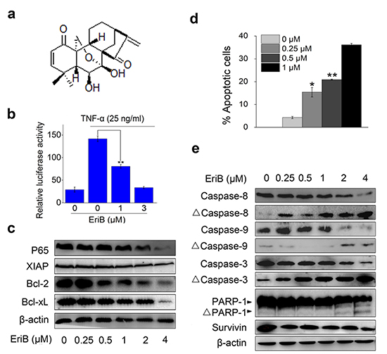Figure 1: EriB inhibits NF-κB signaling and triggers apoptosis. (A) Structure of EriB. (B) HEK293T cells transiently transfeted with p65-Luc were pretreated with EriB and followed by activation with TNF-α. The reporter activity was determined. The values represent the mean ± S.D. (n=3). (C) Western blot analysis of NF-κB downstream target proteins in SMMC-7721 cells with β-actin used as the loading control. (D) SMMC-7721 cells were treated with EriB for 48 h. Apoptosis was analyzed by Annexin V-FITC/PI staining. The values represent the mean ± S.D. (n=3). (E) Lysates from SMMC-7721 cells treated with EriB for 24 h were subjected to western blot analysis. β-actin was used as the loading control. Statistical significance was analyzed by One-way ANOVA, **p<0.01, *p<0.05.