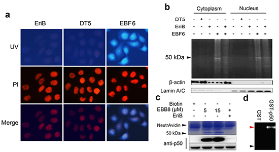 Figure 3: EriB selectively interacts with p50. (A) SMMC-7721 cells were incubated with 1 μΜ EriB, DT5 (dansyl tag alone, Supporting Information) and EBF6 for 3 h, respectively, and the fluorescence was observed under microscopy. Nucleus and EBF6 were recognized by the red and blue fluorescence respectively. (B) The cytoplasmic fraction and nucleic fraction of SMMC-7721 cell lysates were incubated with EBF6 (1 μΜ), with or without the presence of EriB, followed by resolving with SDS-PAGE and imaging under UV transilluminator. β-actin and Lamin A/C are the loading controls of cytoplasmic fraction and the nucleic fraction respectively. (C) SMMC-7721 cell lysates were incubated with EBB8 with or without the presence of EriB, or with biotin alone, followed by pull-down with streptavidin beads. The precipitates were resolved by SDS-PAGE, and the gel was stained with coomassie brilliant blue or subjected to immuno-blotting with p50 antibody, with p50 as the input. (D) Purified human recombinant GST and GST-p50 were incubated with EBF6 (1 μΜ), respectively, for 3 h and after SDS-PAGE the samples were exposed to UV light. The red arrow indicates the GST-p50, and black arrow denotes GST.