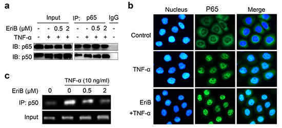 Next we examined the nuclear translocation of NF-κB by immunofluorescence staining of p65 protein. As shown in Figure 4b, obvious translocation of NF-κB was observed 30 min after TNF-α treatment. Pre-incubation of the cells with EriB did not block the translocation of NF- κB stimulated by TNF-α, indicating that EriB does not affect the nuclear translocation of NF-κB either.