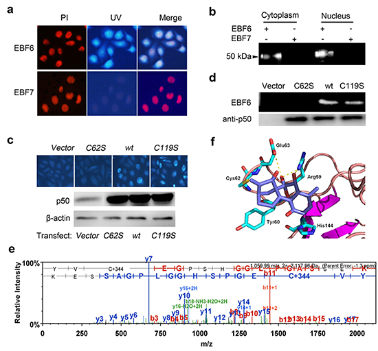FLAG tagged proteins of p50wt and the mutant p50C62S and p50C119S were expressed in SMMC-7721 cells and purified, and then incubated with EBF6 respectively, followed by SDS-PAGE (Figure 5d). Compared with the wide type p50 and p50C119S, the interaction between EBF6 and p50C62S was abolished, which confirmed EriB bound to the cysteine 62 of p50. The covalent modification of cysteine 62 of p50 by EriB was further confirmed by mass spectra analysis. As shown in Figure 5e, a 344 Da increase (the molecular weight of EriB) was found at the Cys62 of the peptide (YVCEGPSHGGLPGASSEK) of p50 (Figure 5e).