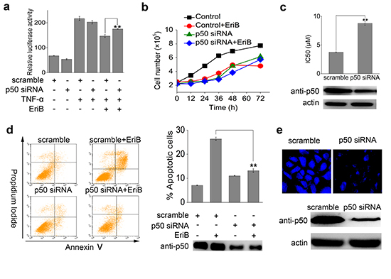 To investigate whether p50 is required for EriB to exert its anti-tumor activity, cell proliferation was studied in cells with p50 knocked down by small interfering RNA (siRNA). Luciferase assay showed that p50 knock-down compromised the NF-κB transcriptional activity suppressed by EriB (Figure 6a). According to the growth curve analysis (Figure 6b), EriB showed obvious inhibitory effects on the proliferation of SMMC-7721 cells (difference between the red curve and the black line). As a result, siRNA mediated knock-down of p50 in SMMC-7721 cells eliminated the antiproliferative activity of EriB, deduced from the cell growth curves (the green curve and the blue curve in Figure 6b). The IC50 of EriB toward cells transfected with p50 siRNA was determined using MTT assay (Figure 6c), with scrambled siRNA as the control. As the result showed, transfection of p50 siRNA attenuated efficiently the cytotoxic activity of EriB, though not remarkable due to probably the relatively low efficiency of interference. Cell apoptosis assay revealed that the apoptotic effect of EriB was markedly weakened in SMMC-7721 cells with p50 knocked down by siRNA (Figure 6d). Furthermore, the intensity of the fluorescence of bound EriB to p50 decreased obviously in p50 knocked-down SMMC-7721 cells, comparing with the control cells (Figure 6e). These data suggest that the interaction between EriB and p50 is required for the anti-tumor activity of EriB.