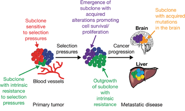 Figure 1: Intratumor heterogeneity and clonal evolution. Adapted from Jamal-Hanjani M, Quezada SA, Larkin J, Swanton C. Translational implications of tumor heterogeneity. Clin Cancer Res 2015; 21: 1258-1266, with permission from AACR [34]. Primary tumors consisting of different subclones may be subjected to various selection pressures (e.g. chemotherapy, and micro-environmental factors such as hypoxia, and infiltrating stromal and immune cells). Under the influence of selection pressures, subclones with intrinsic resistance (green) can outgrow a tumor mass, potentially leading to disease progression, and/or can acquire somatic alterations (purple) promoting cell survival, proliferation, and metastatic tumor formation. The outgrowth of some subclones (red) may be constrained by selection pressures that they are sensitive to; for example, targeted therapy against a tumor subclone with a somatic alteration sensitive to therapy.