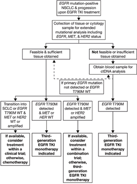 The ongoing characterization of the key drivers of response and resistance to TKI therapies has allowed the identification of molecular biomarkers that may form the basis of diagnosis and personalized treatment for patients with NSCLC [3]. In this section we review some of the key biomarkers and consider their relevance at either the point of initial diagnosis or at clinical or molecular disease progression.