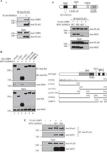 Figure 1: KDM2A associates with 53BP1. (A-i) KDM2A interacts with endogenous 53BP1. HEK293T extracts from cells transfected with an empty vector or FLAG-tagged KDM2A were subjected to immunoprecipitation with anti-FLAG beads. Interaction between KDM2A and 53BP1 was observed by immunoblotting with anti-53BP1. (A-ii) Deletion of the zinc finger domain (564-610) of KDM2A disrupts its interaction with 53BP1. Schematic of KDM2A protein structure (top panel). FLAG-tagged 53BP1 co-expressed with wild type MYC-tagged KDM2A (WT), demethylase-deficient KDM2A (DD) or KDM2A lacking the zinc finger domain (ΔZF) was immunoprecipitated with anti-FLAG beads and immunoblotted with anti-MYC and anti-FLAG. (B) The region comprising residues 1052-1302 of 53BP1 is necessary for its interaction with KDM2A. Schematic of full lenght 53BP1 and mutants (right panel). Lysates from cells expressing HA-tagged 53BP1 mutants and MYC-KDM2A-WT were immunoprecipitated with anti-HA and immunoblotted with anti-HA and anti-MYC. (C) 53BP1 harbors methylated lysine residues. Lysates from cells expressing FLAG-53BP1, co-expressing or not MYC-tagged KDM2A variants, were immunoprecipitated with anti-FLAG beads and immunoblotted with anti-MYC, anti-FLAG and pan-dimethyl lysine antibody (anti-Kme2).