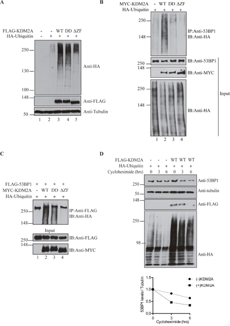 As previously shown (Figure 2B), KDM2A-DD displayed reduced ability to stimulate 53BP1 ubiquitination while KDM2A-ΔZF was incapable of promoting conjugation of ubiquitin to 53BP1.