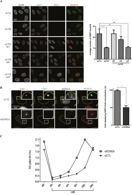 Figure 3: KDM2A modulates the recruitment of 53BP1 to DSBs and entry into mitosis upon IR. (A) KDM2A modulates 53BP1 accumulation at DSBs generated by irradiation. U2OS cells transfected with control siRNA (siCTL) or siRNA targeting the 3’-UTR region of the KDM2A mRNA (siUTR) and stably expressing MYC-tagged KDM2A variants were irradiated (2Gy), fixed 1h later and subjected to immunofluorescence analysis with DAPI, anti-53BP1 (green) and anti-MYC (red). Quantification of immunofluorescence analyses (right panel) shows the average number of 53BP1 IRIF per cell in each condition. Experiments were performed in triplicate. Single (*), double (**) and triple (***) asterisks indicate p<0.05, two-tailed paired Student t-test. Error bars indicate standard deviation. (B) KDM2A depletion impairs 53BP1 recruitment to DNA breaks generated by FokI endonuclease. U2OS-DSB-reporter cells transfected with siCTL or siKDM2A were treated with Shield-1 and 4-OHT to promote expression of mCherry-LacI-FokI (FokI) (red). Immunofluorescence analyses were conducted with anti-53BP1(green) and anti-KDM2A. Quantification of immunofluorescence analyses (right panel) shows the percentage of cells displaying colocalization between 53BP1 and FokI. Asterisk indicates p<0.05, two-tailed paired Student t-test. Error bars indicate standard deviation. (C) KDM2A depletion results in faster progression into mitosis without proper repair of damaged DNA. U2OS cells transfected with siCTL or siKDM2A were left untreated or irradiated (2Gy) and harvested at the indicated time points after irradiation. The percentage of mitotic cells, as indicated by H3pSer10 staining, was determined by flow cytometry. Data shown is representative of experiments replicated three times.