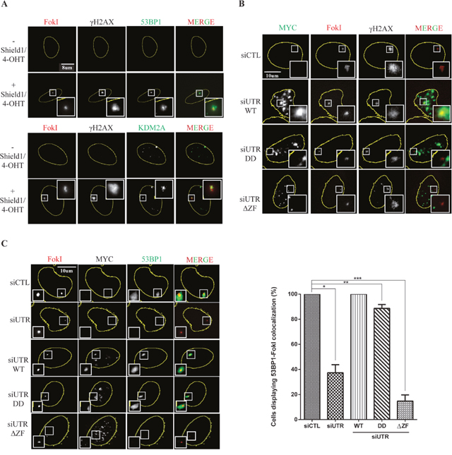 As shown in Figure 2B, while both demethylase and zinc finger domains of KDM2A play a role in stimulating ubiquitination of endogenous 53BP1, deletion of the zinc finger domain resulted in a more severe ubiquitination defect. Thus, our data shows that deficient conjugation of ubiquitin to 53BP1 in the presence of these mutants is consistent with a reduction in the focal recruitment of 53BP1 to sites of DNA damage. In addition, we evaluated whether KDM2A depletion impacted the overall formation of IRIF by proteins harbouring ubiquitin chains. Immunofluorescence analyses using an anti-FK2 antibody (specific to ubiquitin chains), revealed that irradiated KDM2A deficient cells displayed similar FK2 IRIF when compared to cells transfected with control siRNA (Supplementary Figure 2). To further support these observations, we used a previously described U2OS reporter cell line, U2OS-DSB-reporter [31, 32], that stably expresses a fusion protein termed, ER-mCherry-LacI-FokI-DD, which is composed of a modified estradiol receptor fused to mCherry, a lac repressor protein (LacI), the nuclease domain of the FokI endonuclease and a destabilization domain (DD). Upon treatment with the Shield-1 ligand and 4-hydroxytamoxifen (4-OHT), ER-mCherry-LacI-FokI-DD is stabilized, re-localised to the nucleus and directed via its LacI moiety to bind to an integrated array of 256 LacO repeats at a single genomic locus. The FokI endonuclease moiety then generates numerous DNA double strand breaks at these LacO repeats. The localization of ER-mCherry-LacI-FokI-DD can be directly visualized via its mCherry moiety (Supplementary Figure 1B).