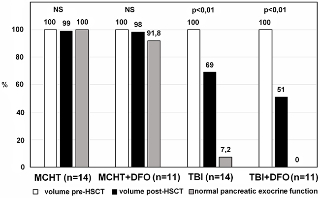 Figure 2: Significant reductions of pancreatic volumes and pancreatic exocrine functions in the TBI-based group compared with almost unchanged pancreatic volumes and functions in the MCHT-based group. MCHT, myeloablative chemotherapy; DFO, deferoxamine; TBI, total body irradiation; HSCT, hematopoietic stem cell transplantation.
