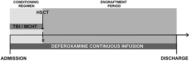Figure 3: Deferoxamine chelation treatment timeline. TBI, total body irradiation; MCHT, myeloablative chemotherapy; HSCT, hematopoietic stem cell transplantation.