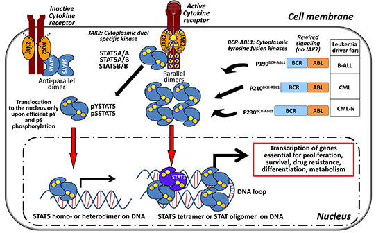 Figure 1: STAT5 – the central signaling node in BCR-ABL1 + leukemia. Canonical activation of STAT5 starts at the cell membrane with cytokine binding to specific receptors. Receptor dimers undergo conformational changes followed by pY phosphorylation and activation of the receptor-associated tyrosine kinase JAK2. JAK2 mediates phosphorylation of the receptor at the cytoplasmic end at specific sites. STAT5 can bind to the receptors as preformed parallel and anti-parallel dimers regardless of its phosphorylation status and is activated by JAK2. The activated STAT5 proteins form parallel homo- or hetero (STAT5A/A; STAT5A/B; STAT5B/B) dimers via their SH2 domains and translocate to the nucleus to bind to the DNA. In BCR-ABL1-induced leukemias a translocation between chromosomes 9 and 22 occurs and results in a constitutive active cytoplasmic tyrosine fusion kinase. Depending on the break-point within the BCR gene three predominant variants of the BCR-ABL1 kinase are known: p190BCR-ABL1, p210BCR-ABL1, p230BCR-ABL1. The associated leukemias are shown next to the different fusion kinases. BCR-ABL1 activity rewires the JAK/STAT signaling in the leukemic cell. STAT5 is directly pY phosphorylated by BCR-ABL1 which makes JAK2 signaling dispensable. STAT5 tetramers and STAT oligomers (with activated STAT3 dimers) bind to the DNA and result in elevated target gene expression for the indicated cellular processes in a leukemic cell.