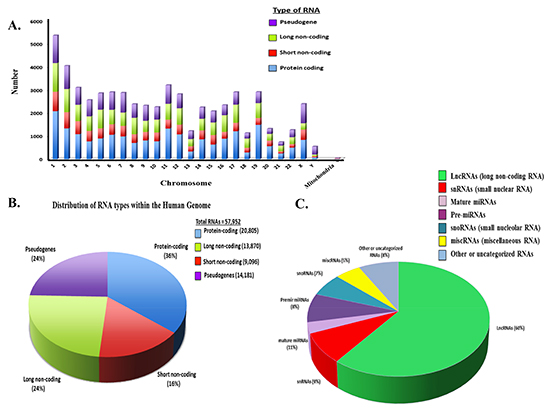 Figure 1: Distribution of Coding and Non-coding RNAs in the Human Genome. (A) Distribution of different RNA types on the individual human chromosomes. Number of coding and ncRNAs is based upon http://useast.ensembl.org and Gencode19. It is noted that the most recent ensembl version indicates a total putative ~140,000 ncRNAs based upon whole genome sequencing. Numbers used here reflect on those RNAs that have been validated. (B) Distribution of RNA types within the human genome. (C) Distribution of non-coding RNA types within the human genome.
