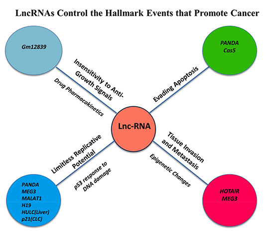 Figure 2: LncRNAs Control the Hallmark Events that Promote Cancer Initiation and Progression. LncRNAs have been linked to the promotion of hallmark features of cancer cells including the insensitivity to anti-growth signals, evading apoptosis, limitless replicative potential and tissue invasion and metastasis.