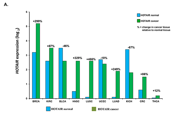 HOTAIR expression has been investigated in tumor samples from many different cancer types. Healthy and cancer tissue was compared to demonstrate that HOTAIR is deregulated in many tumor types (Figure 3A). HOTAIR expression from patients diagnosed with stage IV colorectal cancer (CRC) and liver metastases was shown to correlate with a poor prognosis [89]. In addition, high expression of HOTAIR correlated with the presence of liver metastases. MALAT1 (metastasis-associated lung adenocarcinoma transcript 1) is another lncRNA that has been associated with metastasis and poor prognosis for patients with NSCLC [90]. MALAT1 resides on chromosome 11q13.1 which has been found to harbor chromosomal translocation breakpoints linked to cancer [91, 92]. Other in vitro studies, have implicated MALAT1 in the regulation of the invasive potential of cancer cells, in cervical [93] and lung cancers [94].