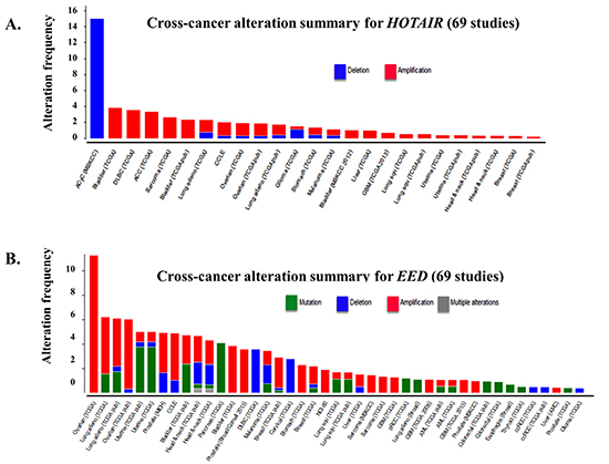 Figure 4: Frequency of HOTAIR alteration and putative HOTAIR-controlled genes across cancer types. (A) Cross-cancer alteration summary for HOTAIR from 69 independent studies to correlate HOTAIR expression with alteration frequency. Potential alterations included mutation, deletion, amplification or multiple alterations. Data was obtained from the cBioportal for cancer genomics (http://www.cbioportal.org/public-portal/, Memorial Sloan-Kettering Cancer Center, NY, NY). (B) Shown is the correlation between the alteration of EED1, a putative target of HOTAIR, across different cancer types. Potential alterations included mutation, deletion, amplification or multiple alterations. Data was obtained from the cBioportal for cancer genomics (http://www.cbioportal.org/public-portal/, Memorial Sloan-Kettering Cancer Center, NY, NY).