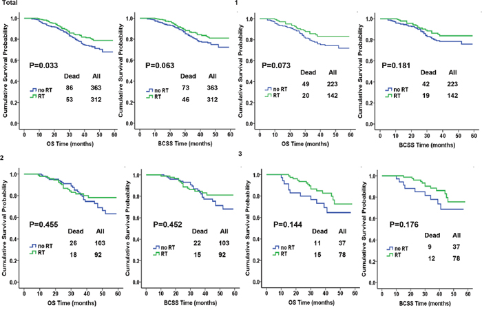 In order to further investigate the effect of PMRT for TNBC patients, we performed multivariate analysis, stratifying according to the number of positive lymph node, which ruled out the impact of unbalanced distribution of chemotherapy between RT and no-RT groups. As shown in Table 3, when HRs of the three subgroups were conducted, no significant improvements in BCSS and OS were observed after PMRT.