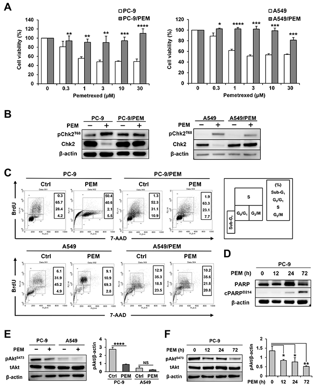 Figure 1: Two combinations of parental and PEM-resistant NSCLC cell lines. (A) Parental and PEM-resistant NSCLC cell lines were treated with the indicated concentrations of PEM for 72 h (PC-9) or 96 h (A549). The cell viabilities were determined by WST-8 assay. The means ± SD are shown. N = 3, *P < 0.05, **P < 0.01, ***P < 0.001, ****P < 0.0001. (B) The total Chk2 and phosphorylated Chk2 (Thr68) protein levels in NSCLC cells treated with 3 μM PEM for 72 h (PC-9) or 96 h (A549) (+) and in untreated control cells (−). (C) NSCLC cell lines were cultured with 3 μM PEM or without PEM (Ctrl) for 72 h (PC-9) or 96 h (A549). Cell cycles were determined after staining with BrdU and 7-AAD using flow cytometry. (D) The PARP and cleaved PARP (Asp214) protein levels in parental PC-9 cells treated with 3 μM PEM for the indicated period. (E) The total Akt and phosphorylated Akt (Ser473) protein levels in parental NSCLC cells treated with 3 μM PEM for 96 h (+) and in untreated control cells (−). The values indicate the mean ± SD. NS, not significant, N = 3, ****P < 0.0001. (ANOVA, Tukey’s multiple comparisons test). (F) The total Akt and phosphorylated Akt (Ser473) protein levels in PC-9 cells treated with 3 μM PEM for the indicated period. The values indicate the mean ± SD. N = 3, *P < 0.05, **P < 0.01 (ANOVA, Tukey's multiple comparisons test).
