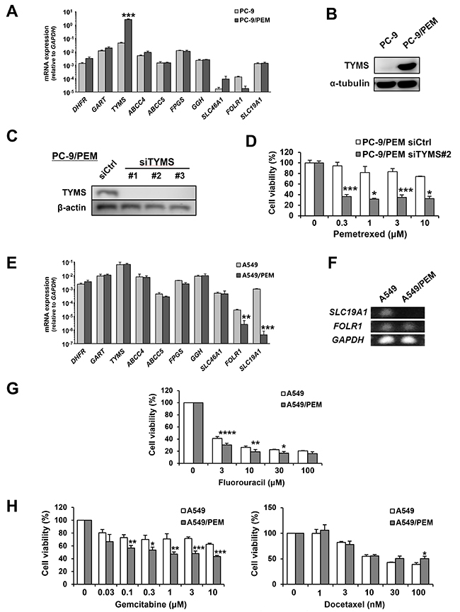 Figure 3: Two different variations of PEM-resistant cell lines. (A) The mRNA expression of genes related to the mechanism of action of PEM in PC-9 and PC-9/PEM cells was assessed by an RT-qPCR. The means ± SD of the mRNA expression of each cell line are shown. N = 3, ***P < 0.0001. (B) The TYMS protein levels in PC-9 or PC-9/PEM cells were examined by immunoblotting. (C) PC-9/PEM cells that were transfected with negative control siRNA or TYMS siRNA. The protein levels of TYMS were examined by immunoblotting. (D) PC-9/PEM cells pre-transfected with control or TYMS (#2) siRNA were examined for the sensitivity to PEM. The cell viabilities were determined by WST-8 assay. The means ± SD are shown. N = 3, *P < 0.05, ***P < 0.001. (E) The mRNA expression of genes related to the mechanism of action of PEM in A549 and A549/PEM cells was assessed by an RT-qPCR. The means ± SD of the mRNA expression of each cell line are shown. N = 3, **P < 0.001, ***P < 0.0001. (F) An agarose-gel electrophoresis image of the SLC19A1 and FOLR1 PCR products of the RT-qPCR. GAPDH expression was used as a control. (G) A549 and A549/PEM cell lines were treated with fluorouracil (48 h). The cell viabilities were determined by WST-8 assay. The means ± SD are shown. N = 3, *P < 0.05, **P < 0.01, ****P < 0.0001. (H) A549 and A549/PEM cell lines were treated with gemcitabine (48 h) or docetaxel (48 h). The cell viabilities were measured by WST-8 assay. The means ± SD are shown. N = 3, *P < 0.05, **P < 0.01, ***P < 0.001.