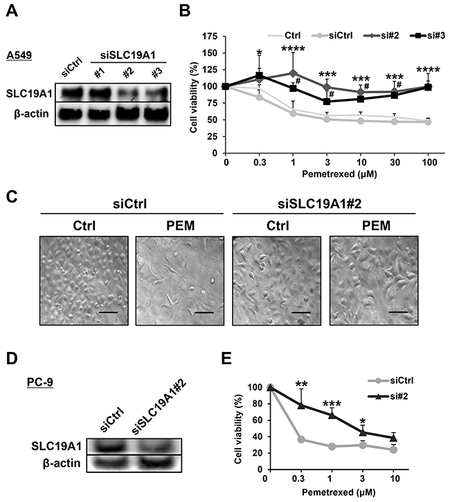 Figure 4: SLC19A1 negatively regulates PEM-sensitivity in NSCLC cell lines. (A) Three types of SLC19A1 siRNAs and negative control siRNA were transfected into A549 cells, and the SLC19A1 protein levels were examined by immunoblotting. (B) Negative control siRNA (siCtrl) or SLC19A1 (#2 and #3) siRNAs was transfected into A549 cells. Control A549 cells (Ctrl) were used as a control without transfection. The cell viabilities were determined by WST-8 assay. The means ± SD are shown. Similar results were obtained in three independent experiments. N = 3, (siCtrl vs. si#2, *P < 0.05, ***P < 0.001, ****P < 0.0001) (siCtrl vs. si#3, #P < 0.05). (ANOVA, Dunnett's multiple comparisons test). (C) Microscopic images (×100) of siRNA-transfected A549 cells treated with or without PEM (30 μM for 96 h). Scale bar = 100 μm. (D) PC-9 cells that were transfected with negative control siRNA or SLC19A1 (#2) siRNA. The protein levels of SLC19A1 was examined by immunoblotting. (E) Negative control siRNA (siCtrl) or SLC19A1 (#2) siRNA was transfected into PC-9 cells. The cell viabilities were determined by WST-8 assay. The means ± SD are shown. N = 3, *P < 0.05, **P < 0.01, ***P < 0.001.