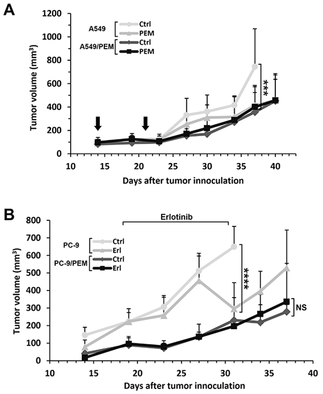 Figure 6: The drug responses of PEM-resistant human NSCLC tumors in nude mice treated with PEM or erlotinib. (A) The time course of the tumor volume. A549 or A549/PEM cells were subcutaneously inoculated into the right flank of nude mice on day 0. PEM treatment (200 mg/kg) or vehicle control (Ctrl) were administered by intraperitoneal injection on days 14 and 23. The arrows indicate the days of PEM injection. The values indicate the mean tumor volume ± SD. N = 5, ***P < 0.001 (ANOVA, Tukey's multiple comparisons test). (B) The time course of the tumor volume. PC-9 or PC-9/PEM cells were subcutaneously inoculated into the right flank of nude mice on day 0. Erlotinib (Erl) (50 mg/kg) or vehicle control (Ctrl) were administered by oral gavage once daily, 6 days a week. The values indicate the mean tumor volume ± SD are shown. N = 5; NS, not significant; ****P < 0.0001 (ANOVA, Tukey's multiple comparisons test).