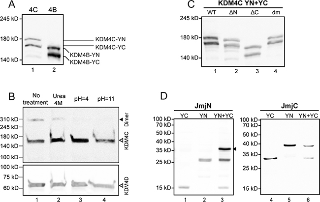 Figure 3: Evaluation of protein expression by Western blot analyses. The expression of exogenous YN- and YC-tagged proteins was evaluated following transfections of HEK293 cells, while expression and dimerization of the endogenous KDM4C was evaluated in K562 cells, as described in the Methods section. (A) Expression of YN- and YC-tagged KDM4C and KDM4B in nuclear extracts detected by anti-YFP specific antibody; (B) Expression and dimerization of endogenous nuclear KDM4C, treated with either 4 M urea, pH = 4 or pH = 11 buffers, and visualized by a KDM4C-specific antibody (upper panel). The size of KDM4C dimers is indicated by a solid arrowhead. The membrane was stripped and reprobed with an anti-KDM4D antibody as a loading control (bottom panel); (C) Nuclear expression of the YN- and YC-tagged WT and mutant KDM4C lacking the JmjN domain (ΔN) or the JmjC domain (ΔC), as well as the double mutant harboring p.E24A/E25A + p.H42A/R43A (dm), visualized by a KDM4C-specific antibody; (D) Expression and dimerization capacity of the individual YN- and YC-tagged JmjN and JmjC domains in total cell extracts, detected by an anti-YFP antibody. The JmjN homodimer is indicated by an arrowhead. The results are representative of at least three independent experiments.