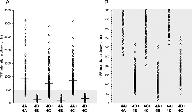 Figure 4: Quantitative image analysis of the levels of KDM4A-C homo- and heterodimerization. HEK293 cells were co-transfected with each of the YN- and YC-tagged KDM4A-C pairs (i.e. KDM4A-YC + KDM4A-YN, KDM4B-YC + KDM4B-YN, KDM4C-YC + KDM4C-YN, KDM4A-YC + KDM4B-YN, KDM4A-YC + KDM4C-YN or KDM4B-YC + KDM4C-YN), and IF microscopy was performed. An anti-YFP specific antibody was used to mark transfected cells while the reconstitution of the YFP fluorescence represented the level of dimerization. Cells were visualized by a scanning confocal microscope at a ×63 magnification, and images were analyzed using the Imaris image analysis software. Each circle represents the mean YFP fluorescence intensity in a positively transfected cell. The average YFP fluorescence of each group is marked by a horizontal line. An expanded view of the lower section of the Y axis (YFP intensity ≤500) is depicted in panel B. Statistical parameters are detailed in Table 1. Any comparison between a pair containing KDM4B to a pair consisting solely of KDM4A/C had a P-value ≤ 7.4 × 10−32.
