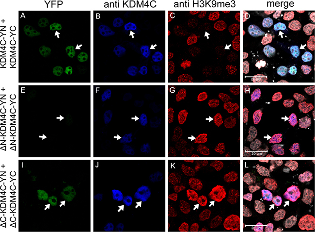 After establishing that KDM4C dimerizes under physiological conditions, we aimed to determine whether or not the JmjN domain serves as its dimerization interface. Towards this end, KDM4C YN and YC conjugates lacking their JmjN domain (termed ΔN-KDM4C-YN/YC) were evaluated in comparison to the WT KDM4C, which served as a positive control in the following experiments: First, ΔN-KDM4C-YN and ΔN-KDM4C-YC were co-transfected into HEK293 cells and visualized by live cell imaging (Supplementary Figure 2A-c). No YFP fluorescence was detected, indicating that ΔN-KDM4C did not homodimerize. Second, IF microscopy was performed to verify ΔN-KDM4C expression using a KDM4C-specific antibody, and to test its demethylase activity with an anti-H3K9me3 antibody (Figure 6, blue and red fluorescence, respectively). ΔN-KDM4C monomers were properly detected and co-localized with the DNA dye DRAQ5 (Figure 6, right panel, white fluorescence); however, they did not display any YFP fluorescence, indicating that they did not dimerize (Figure 6, compare image E to image A). Furthermore, cells expressing ΔN-KDM4C had substantially higher levels of H3K9me3 when compared to untransfected cells in the same microscope field (Figure 6G, arrows), indicating that ΔN-KDM4C is devoid of H3K9me3 demethylation activity. It is possible that ΔN-KDM4C inhibits endogenous KDM4C by binding to H3K9me3 without exerting its demethylation activity, resulting in increased H3K9me3 levels. To show that not every deletion of a given KDM4C domain results in loss of dimerization capability, we constructed expression vectors harboring KDM4C YN/YC monomers which lack the JmjC domain (aa 144–310, ΔC-KDM4C-YN/YC) and tested their dimerization capacity using IF assays (Figure 6, bottom row). ΔC-KDM4C monomers were expressed at levels comparable to the WT- and ΔN-KDM4C monomers (Figure 6, compare images J, B and F, respectively) and displayed co-localization with H3K9me3 (Figure 6L). This implied that the ΔC-KDM4C monomers are properly sorted to the nucleus and that they are devoid of demethylase activity as previously shown [40]. In contrast to ΔN-KDM4C, ΔC-KDM4C monomers displayed YFP fluorescence demonstrating the retention of their homodimerization capacity (Figure 6I). The expression of both YN- and YC-monomers of the KDM4C deletion mutants was verified by WB analysis (Figure 3C). All monomers were expressed and visualized at the correct MW, though to a lesser degree. These findings support the conclusion that the JmjN domain is essential for the homodimerization of KDM4C. They also agree with previous reports that the JmjN domain is necessary for KDM4C demethylation activity [20]. Hence, we postulate that KDM4C dimerization is indispensable for its H3K9me3 demethylation activity.