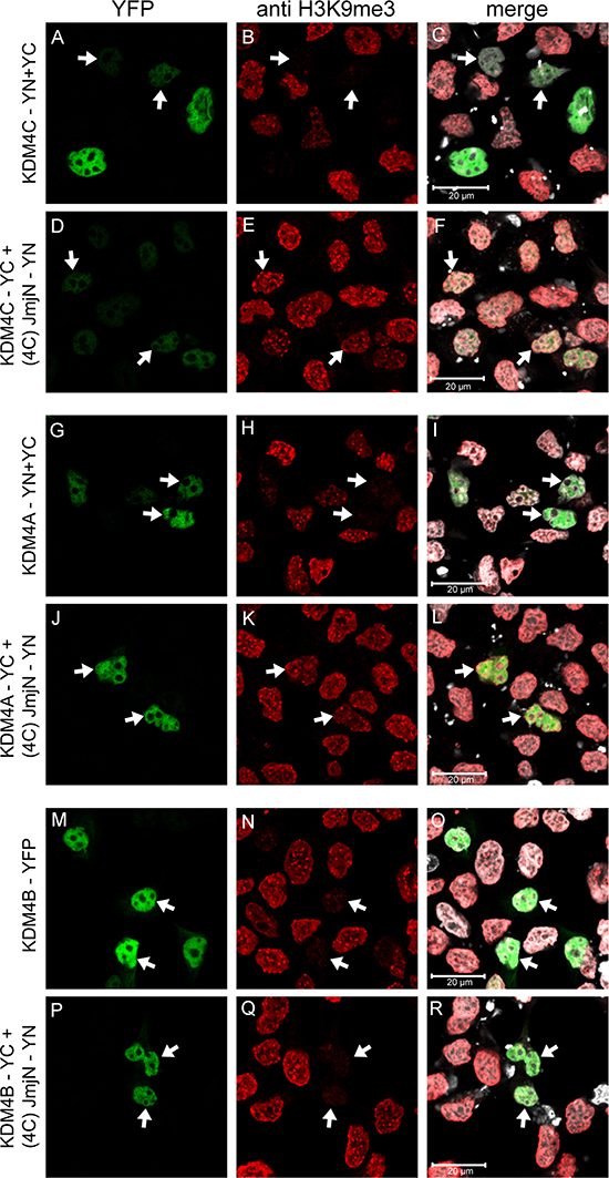 Figure 9: IF microscopy depicting the effect of heterodimerization with the individual JmjN peptide on H3K9me3 demethylation by KDM4A-C. HEK293 cells were transiently co-transfected with the YN-tagged JmjN peptide of KDM4C [i.e. (4C)-JmjN-YN] and either of the YC-tagged KDM4A-C. The controls were either co-transfections of the YN- and YC-tagged KDM4A/C (for KDM4A/C-JmjN heterodimers) or a transfection with the YFP-tagged KDM4B (for KDM4B-JmjN heterodimer). Green fluorescence represents YFP, red fluorescence represents H3K9me3 staining, Blue fluorescence represents anti-HA staining, whereas white fluorescence represents the DNA dye DRAQ5. Arrows indicate specific cells which display dimerization of the exogenous proteins. Cells were visualized by scanning confocal microscopy at a ×63 magnification. All fields are representative of at least three independent experiments.
