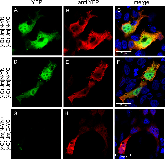 To confirm that JmjN is not a sticky peptide that can interact with various irrelevant peptides, we performed IF microscopy in HEK293 cells co-transfected with YN- and YC-conjugated JmjN monomers from KDM4B/C or with JmjN-YN and JmjC-YC monomers using an antibody against YFP as a transfection marker (Figure 7, red fluorescence). The isolated JmjN from both enzymes displayed YFP fluorescence demonstrating dimerization, in concordance with the live cell imaging results (Figure 7A and 7D). The JmjN and JmjC peptides did not dimerize, as evidenced by the lack of YFP fluorescence (Figure 7G), thus emphasizing the precise nature of the JmjN-dependent homodimerization. Finally, the expression levels of the YN- and YC-conjugated JmjN and JmjC monomers were confirmed by WB analysis with an anti-YFP antibody (Figure 3D). While the YN- and YC-conjugated JmjN peptides were detected both as monomers and as a dimer (MW: 25, 15 and 40 kD, Figure 3D, lanes 1–3, respectively), JmjC YN and YC-tagged peptides were detected only as monomers (37 and 27 kD, Figure 3D, lanes 4–6, respectively). These findings confirmed that JmjN-JmjN interactions were the driving force for dimerization, and not a side effect of the YFP reconstitution.
