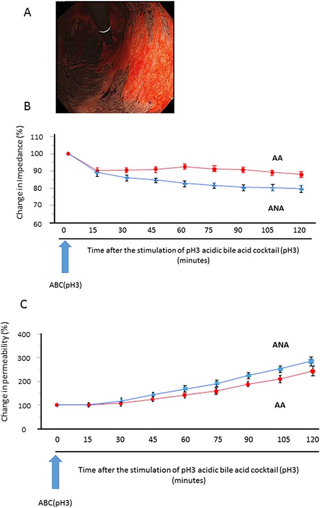 Figure 1: Sequential change of mucosal barrier function after stimulation with acidic bile cocktail (ABC) in a mini-Ussing chamber system. (A) As a representative image, we clearly identified the distribution of AA (black) and ANA (red) by Congo-red chromoendoscopy, whose color is changed due to the reaction with gastric acid, and biopsy samples were taken from each area. (B) Mucosal impedance decreased gradually for 120 minutes immediately after the ABC stimulation, and its decrease in the specimens from ANA (blue) was significantly greater than in those from AA (red) (P = 0.043, N = 18, mixed effects model). (C) Mucosal permeability increased with time, and its increase in the specimens from ANA (blue) tended to be larger than that from AA (red), despite the lack of significant difference (P = 0.309, mixed effects model).