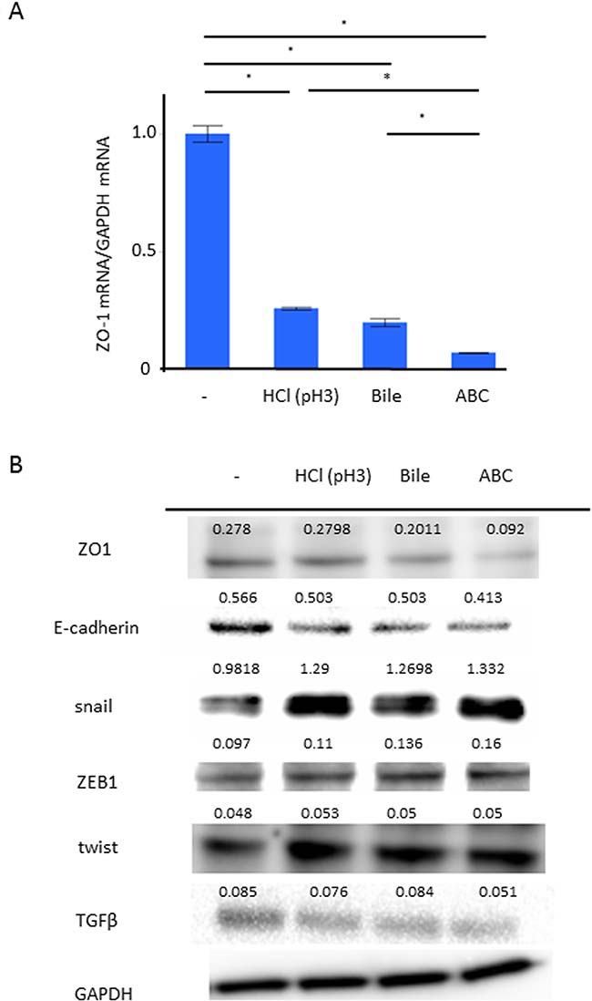 Figure 3: Effect of the ABC exposure to gene expressions of TJ/AJ and EMT. The expression of ZO-1 in AGS with the 24-hour stimulation of weak acid, bile acid, and ABC was investigated. (A) RT-qPCR demonstrated that, compared to control, the expression of ZO-1 mRNA was significantly inhibited in the group stimulated by weak acid or bile acid, and even more significantly inhibited in the ABC-stimulated group (P < 0.05, N = 5, Turkey-Kramer HSD test). (B) The expressions of TJ/AJ proteins were investigated in Western blot analyses.
