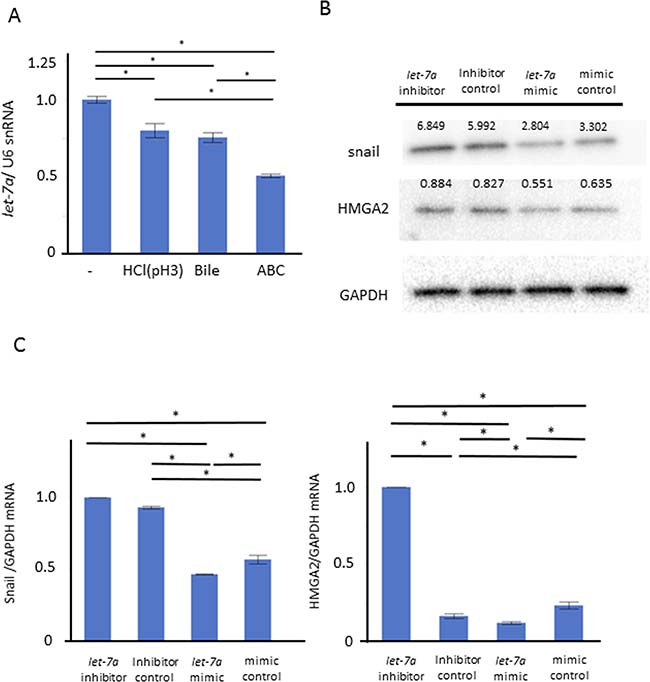 Figure 5: Role of let-7a in barrier dysfunction by ABC stimulation. We performed an in vitro study using AGS to clarify the role of let-7a in maintaining the barrier function. (A) Compared to control, the let-7a expression was significantly inhibited in the group stimulated with weak acid or bile acid, and even further inhibited in the ABC-stimulated group (N = 6, P < 0.05, Tukey-Kramer test). (B) The plasmid of let-7a inhibitor, mimic, and the negative control were transfected in AGS to investigate the effect on the induction of HMGA2 as well as snail (N = 5). (C) Transfection with the let-7a inhibitor plasmid increased the expressions of HMGA2 and snail at the mRNA levels. Transfection with the let-7a mimic plasmid decreased their expressions (N = 5).