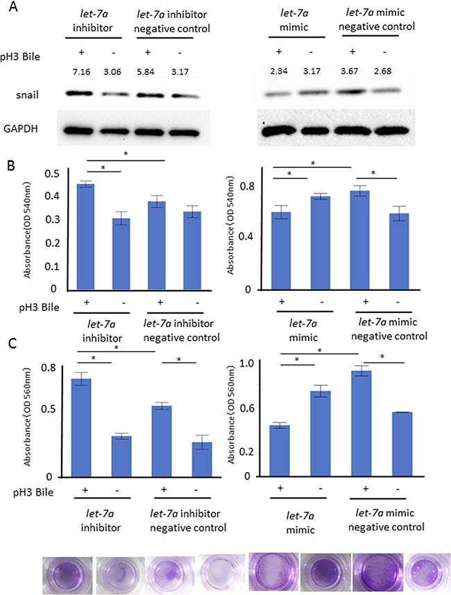 Figure 6: Functional role of let-7a in barrier dysfunction. Cell proliferation and cell infiltration ability were investigated with/without the ABC stimulation on the AGS transfected with a let-7a inhibitor, mimic, negative control plasmids. The snail expression (A) as well as MTT cell proliferation (B) and cell infiltration ability (C) were enhanced under the let-7a inhibition, while they were inhibited by the let-7a induction (A) N = 5, (B) P < 0.05, N = 4, Tukey-Kramer test, (C) P < 0.05, N = 4, Tukey-Kramer test, representative photo of cellular infiltration assay).