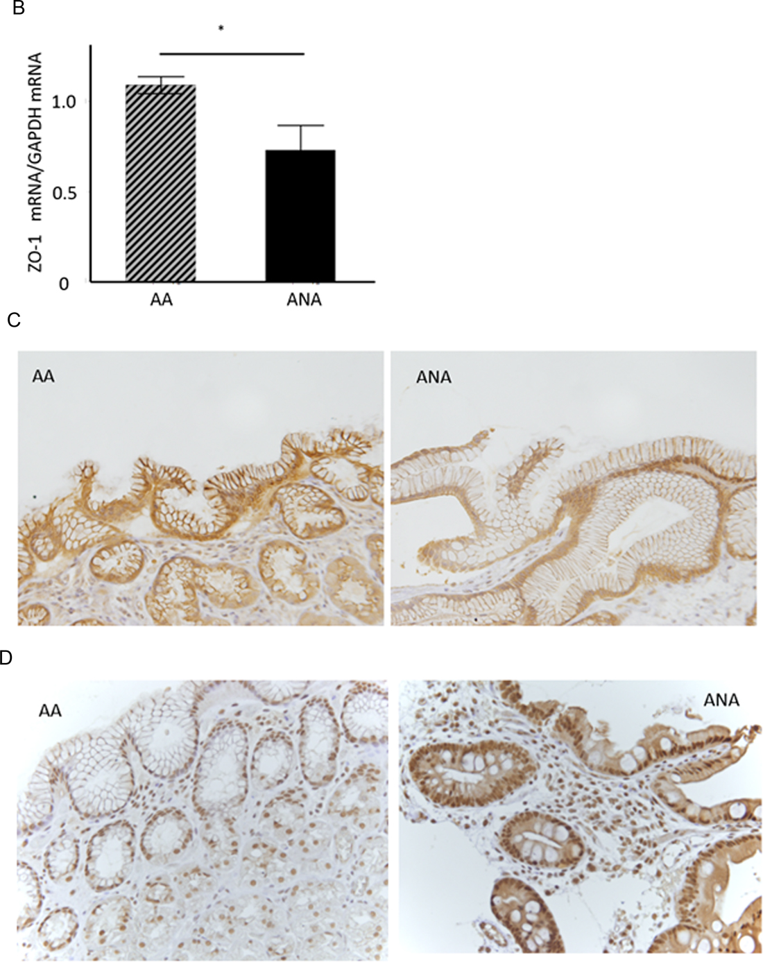 As a validation phase, the expression of ZO-1 mRNA in the samples from ANA was significantly diminished compared to those from AA (Figure 2B, ZO-1mRNA/GAPDH mRNA: 0.78 (0.49 S.D.) vs. 1.09 (0.17 S.D.): N = 18, P = 0.008, Student’s t-test). An immunohistochemical study demonstrated that the scoring index of ZO-1 protein in ANA was significantly decreased compared to those in AA (Figure 2C, low expression/high expression: ANA vs. AA = 17/1 vs. 10/8, P = 0.007, Chi-square test). The expression of claudin-12 protein in ANA was also lower than that in AA (data not shown), while the expression of snail protein in ANA was higher than that in AA (Figure 2D). From these investigations using ex vivo human specimens, it became evident that mucosal barrier damage of ANA was markedly greater than that of AA.