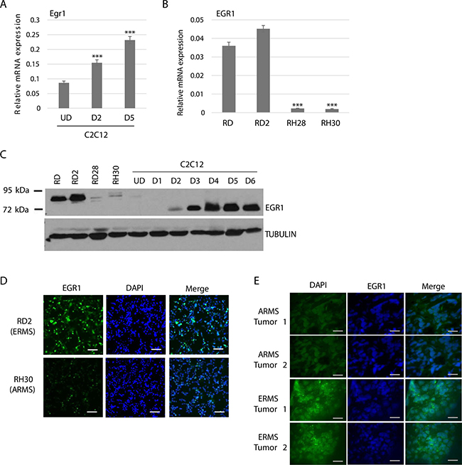 Figure 1: EGR1 is upregulated during muscle differentiation and differentially expressed in RMS. (A) EGR1 mRNA is up regulated upon C2C12 differentiation. C2C12 cells were assayed for EGR1 expression by qRT-PCR while proliferating (UD) and after 2 days (D2) and 5 days (D5) of differentiation. Error Bars, S.D. and ***P > 0.001 vs. UD. (B) EGR1 is differentially expressed in RMS. EGR1 gene expression was assayed in ERMS (RD, RD2) and ARMS (RH28, RH30) cell lines by qRT-PCR. Error bars, S.D. and ***P > 0.001 vs. RD. (C) EGR1 protein is also differentially expressed. EGR1 protein level in ERMS (RD and RD2), ARMS (RD28 and RH30) and C2C12 cells was assayed by western blot with antibodies against EGR1. (D) Immunohistochemistry of RD2 and RH30 cells shows differential EGR1 expression in RMS. Images were taken at 200× magnification and scale bars represent 100 μm (E) Human tumors also show differential expression of EGR1 in RMS. Immunohistochemistry was performed on primary human RMS tumor sections with antibodies against EGR1 and DAPI. Images were taken at 200× magnification and scale bars represents 100 μm. Each tumor slide represents an individual tumor.