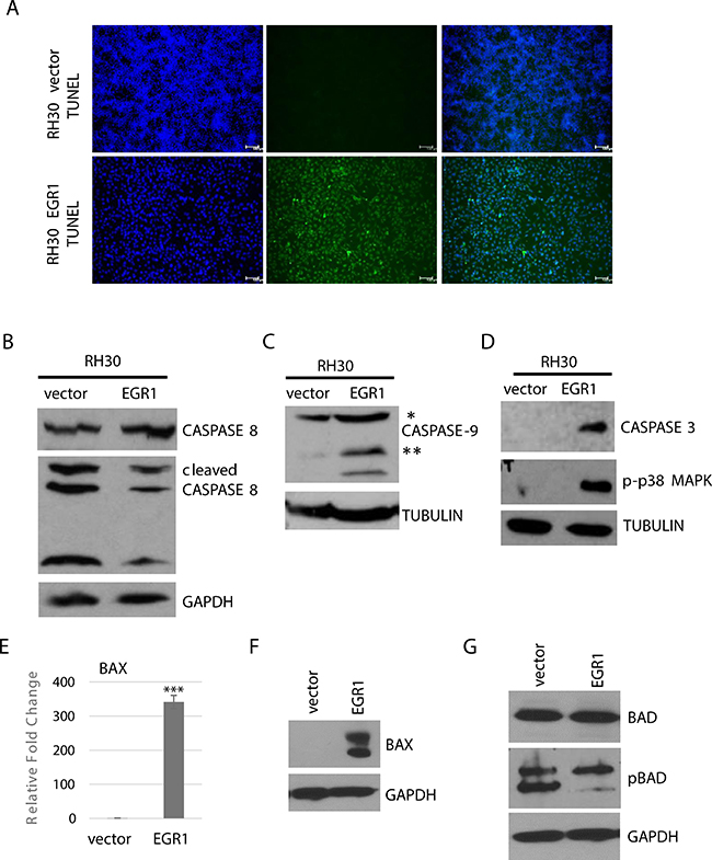 Figure 6: EGR1 over expression induces intrinsic cell apoptosis. (A) RH30 cells over expressing EGR1 or vector control were subject to differentiation conditions for 4 days and apoptosis was detected by TUNEL assay. (B) Caspase 8 cleavage is not affected by EGR1. Cells as described in A were assayed by western blot analysis. (C) Caspase 9 cleavage is induced by EGR1, assayed as in (B). Single asterisk indicates full length protein; double asterisks indicate cleaved products. (D) Caspase 3 and p-p38 are induced by EGR1, assayed as in B. BAX1 is upregulated by EGR as assayed by qRT-PCR (E) and western blot assay (F). Error Bars, S.D. and ***P > 0.001 vs. vector (G) Phosphorylated BAD (pBAD) is downregulated in response to EGR1.
