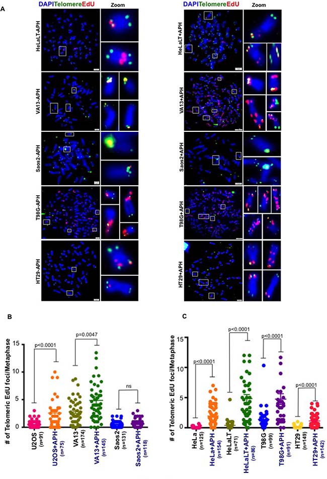 Figure 2: Spontaneous MiDAS at telomeres is not limited to ALT-associated telomeres. (A) Representative images and quantification of EdU (red) incorporation at telomeres (marked by telomeric FISH; green) on metaphase chromosomes (stained with DAPI; blue) in a series of (B) ALT and (C) telomerase positive cell lines with and without low dose APH. Data represent the means of at least three independent experiments. Error bars indicate SEM. See also Supplementary Figure 2.