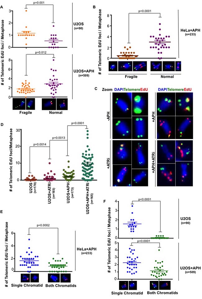 Figure 3: Replication stress induced telomeric MiDAS does not correlated with telomere fragility. Quantification of telomeric EdU foci associated with either morphologically fragile or normal telomeres in (A) untreated U2OS cells or low dose APH-treated U2OS and (B) HeLa cells. (C) Representative images and (D) quantification of EdU incorporation (red) at telomeres (marked by telomeric FISH; green) on metaphase chromosomes (DAPI stained; blue) in U2OS cells. Where indicated, cells were exposed to low dose APH and 5 μM ATRi. Quantification of telomeric EdU foci located either on a single chromatid or on both chromatids in (E) APH-treated HeLa cells and (F) U2OS cells in both untreated or APH-treated conditions. Data represent the means of at least three independent experiments. Error bars indicate SEM. See also Supplementary Figure 3.