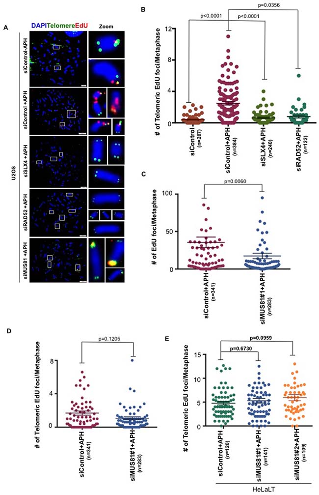 MiDAS at CFSs is proposed to be a BIR-like process that is mediated by a RAD52-dependent, but RAD51-independent, form of homologous recombination. In addition, CFS-MiDAS has a strong requirement for the SLX4 scaffold protein and its associated endonuclease MUS81-EME1 [14, 15, 18]. To investigate the mechanism for telomeric MiDAS, we chose to focus on U2OS cells due to the high levels of telomeric MiDAS exhibited by these cells. We individually depleted SLX4, RAD52 and MUS81 in U2OS cells. In agreement with previous data on CFSs, we observed that SLX4 and RAD52 are required for telomeric MiDAS (Figure 4A, 4B and Supplementary Figure 4A, 4B). However, in contrast to CFS-associated MiDAS (Figure 4C), the MiDAS occurring at telomeres was apparently independent of MUS81-EME1 in U2OS cells (Figure 4D and Supplementary Figure 4A). To further confirm this in a non-ALT cell line, we chose HeLaLT cells and depleted MUS81 using two previously validated siRNAs. Similarly to U2OS cells, we observed that telomeric MiDAS in HeLaLT cells does not require MUS81 (Figure 4E and Supplementary Figure 4C).