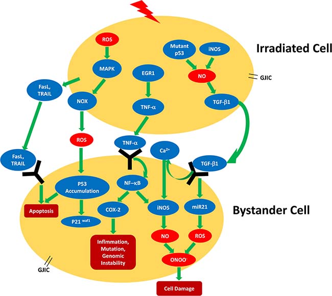 Abbreviations: EGR-1, early growth response protein 1; GJIC, gap junctional intercellular communication; IL-1α, interleukin-1α; IL-6, interleukin-6; IR, ionizing radiation; NO, nitic oxide; PI3K, phosphoinositide 3-kinase; ROS, reactive oxygen species; TGF-β1, tumor growth factor-beta1; TNF-α, tumor necrosis factor-α, TRAIL, tumor necrosis factor-related apoptosis-inducing ligand.