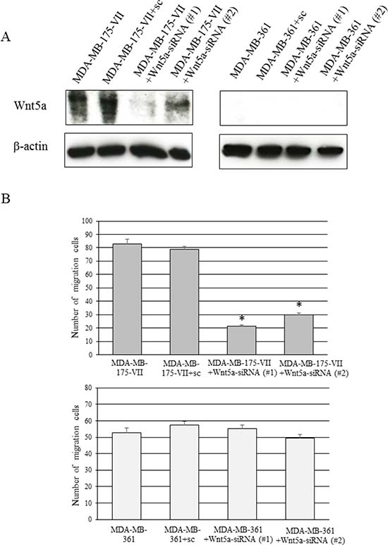 Figure 6: Knockdown of ALCAM decreases the Wnt5a-induced increase in migratory capacity. (A) Wnt5a and ALCAM expression of MDA-MB-175-VII cells transfected with ALCAM-siRNAs (ALCAM-siRNA #1 and #2) and sc. (B) The migratory capacity of MDA-MB-175-VII cells transfected with ALCAM-siRNAs and sc. Data are presented as the mean ± SE of three migration assays. Data were evaluated using the Mann–Whitney U-test.
