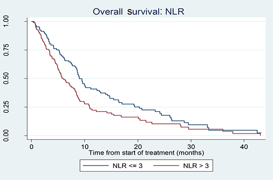 Figure 1: Kaplan Meier curve showing survival in patients with NLR ≤ 3 versus NLR > 3.