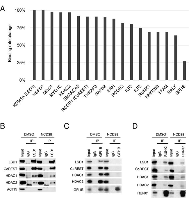 Figure 2: Selective impairment of the interaction between LSD1 and GFI1B by NCD38. (A) Binding rate change of LSD1 partners after the NCD38 treatment. The binding rate change was calculated as the normalized abundances in NCD38-treated cells divided by those in DMSO-treated cells. Values normalized to the binding rate change of LSD1 are shown. (B–D) Co-IP-WB with anti-LSD1 (B), anti-GFI1B (C), or anti-RUNX1 antibody (D) in HEL cells treated with DMSO or NCD38 for 24 hours. Normal IgG was used as a negative control. Indicated antibodies were used to detect target proteins. ACTIN was used as a negative control unbound to LSD1. Experiments in (B–D) were performed independently at least three times and the representative data are shown.
