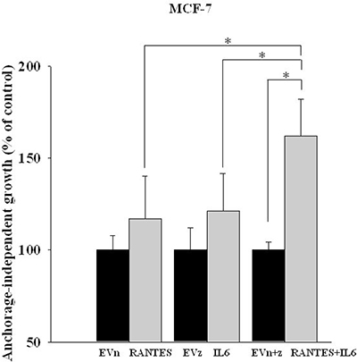 Figure 1: Anchorage-independent growth of clones of MCF-7 cells transfected with RANTES and/or IL-6. The growth in soft agar of MCF-7RANTES, MCF-7IL6, MCF-7RANTES+IL6 and control cells was performed as described in the Material and Methods (*P < 0.05; Student’s t-test). EVn: cells transfected with the empty vector (neomycin); EVz: cells transfected with the empty vector (zeocin); EVn+z: cells transfected with both empty vectors.
