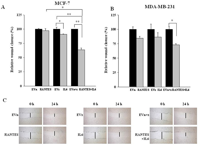 Figure 3: Effects of the overexpression of RANTES and/or IL-6 on wound healing in MCF-7 and MDA-MB-231 cells. Wound healing assays were performed on (A) MCF-7RANTES, MCF-7IL6, MCF-7RANTES+IL6 cell lines and control cells and (B) MDA-MB-231RANTES, MDA-MB-231IL6, MDA-MB-231RANTES+IL6 cell lines and their respective control cells (*P < 0.05; **P < 0.005; Student’s t-test). (C) Representative images of the wound tracks at time point zero and after 24 h were shown for MCF-7 derived clones (magnification of 20X). EVn: cells transfected with the empty vector (neomycin); EVz: cells transfected with the empty vector (zeocin); EVn+z: cells transfected with both empty vectors.