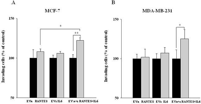 Figure 4: Invasive ability of MCF-7 and MDA-MB-231-derived stable clones overexpressing RANTES and/or IL-6. The invasive ability of (A) MCF-7RANTES, MCF-7IL6, MCF-7RANTES+IL6 cell lines and control cells and (B) MDA-MB-231RANTES, MDA-MB-231IL6, MDA-MB-231RANTES+IL6 cell lines and their respective control cells, was determined using a Boyden chamber-based colorimetric assay (*P < 0.05; **P < 0.005; Student’s t-test). EVn: cells transfected with the empty vector (neomycin); EVz: cells transfected with the empty vector (zeocin); EVn+z: cells transfected with both empty vectors.