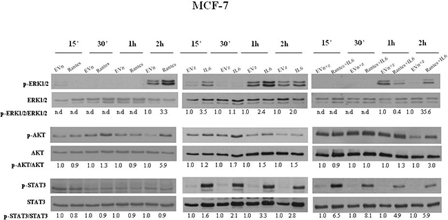 Figure 5: Analysis of the activation of ERK1/2, AKT and STAT3 in MCF-7 stable clones. Western Blot analysis for the expression of phosphorylated and total ERK1/2, AKT and STAT3 in MCF-7 cells overexpressing RANTES and/or IL-6 at the indicated time points. Densitometric value ratios for pERK1/2/total ERK1/2, pAKT/total AKT and pSTAT3/total STAT3 were shown for each panel. EVn: cells transfected with the empty vector (neomycin); EVz: cells transfected with the empty vector (zeocin); EVn+z: cells transfected with both empty vectors.