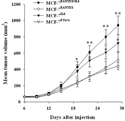 Figure 7: IL-6 and RANTES promote MCF-7 tumor growth in vivo. MCF-7 stable transfectants were orthotopically injected in nude mice under estrogen supplementation. Six mice were injected with MCF-7RANTES, MCF-7IL6 or MCF-7RANTES+IL6 cells, and 8 mice were injected with MCF-7EVn+z cells. Data are expressed as the mean tumor volume values ± SE (*P < 0.05; **P < 0.005 Student’s t-test for comparison between MCF-7 stable transfectants versus MCF-7 transfected with both empty vectors at the different time points). EV: empty vector; n: neomycin; z: zeocin.